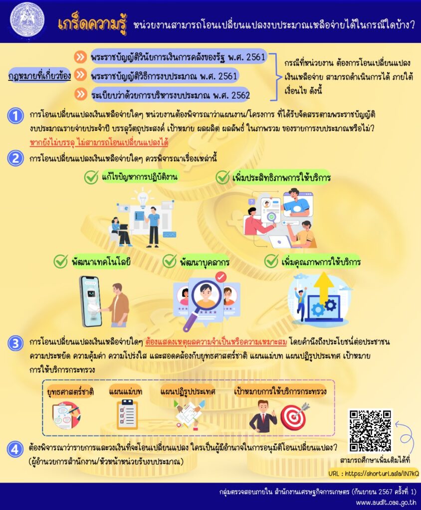 ด้านงบประมาณเกร็ดความรู้ เรื่อง หน่วยงานสามารถโอนเปลี่ยนแปลงงบประมาณเหลือจ่ายได้ในกรณีใดบ้าง Admin1 สัปดาห์ ago01 mins แนะแนวเรื่อง Previous: เกร็ดความรู้ การใช้จ่ายงบประมาณรายจ่ายประจำปีNext: เกร็ดความรู้เรื่อง การควบคุมการใช้จ่ายงบประมาณควรดำเนินการอย่างไร ใส่ความเห็น ยกเลิกการตอบอีเมลของคุณจะไม่แสดงให้คนอื่นเห็น ช่องข้อมูลจำเป็นถูกทำเครื่องหมาย *ความเห็น * ชื่อ * อีเมล * เว็บไซต์ บันทึกชื่อ, อีเมล และชื่อเว็บไซต์ของฉันบนเบราว์เซอร์นี้ สำหรับการแสดงความเห็นครั้งถัดไป